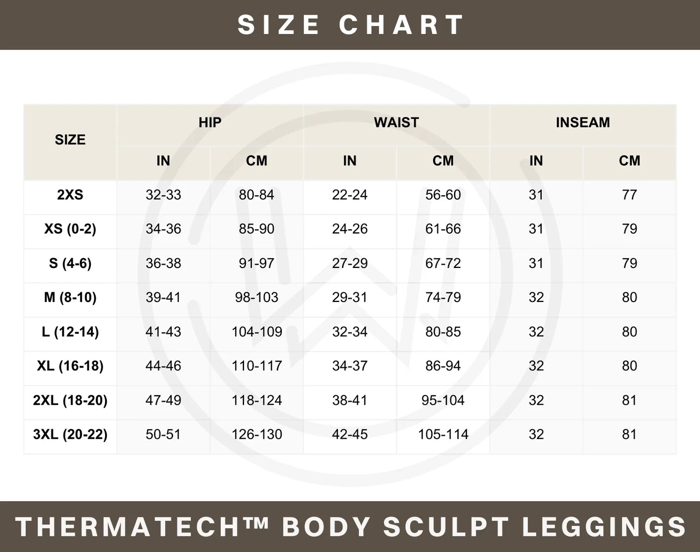 Use this chart to match your hip, waist, and inseam measurements to the best-fitting ThermaTech® Body Sculpt Leggings size.