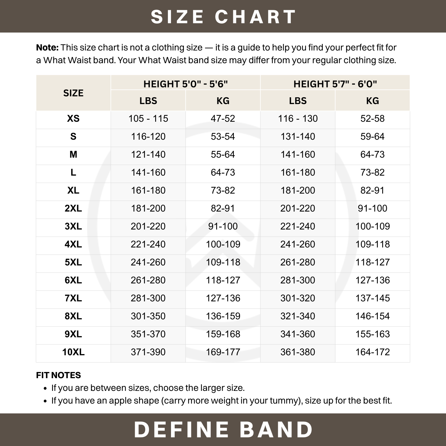 Use this chart to match your height, weight, and waist measurements to the best-fitting Define Band size. This band runs small, so the size you receive may differ from what you typically expect.