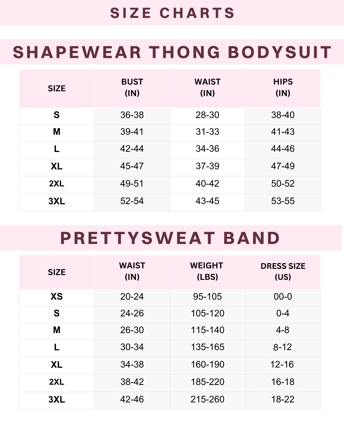 Use this chart to match your measurements to your best fitting band and bodysuit sizes. These products are designed with different levels of compression, so your size may vary between items.