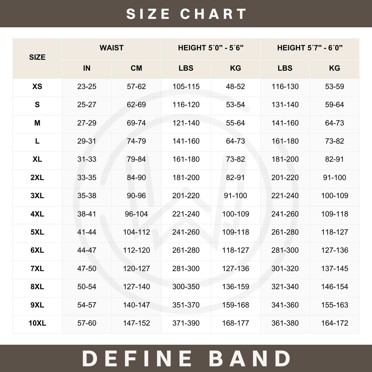 Use this chart to match your height, weight, and waist measurements to the best-fitting Define Band size. This band runs small, so the size you receive may differ from what you typically expect.